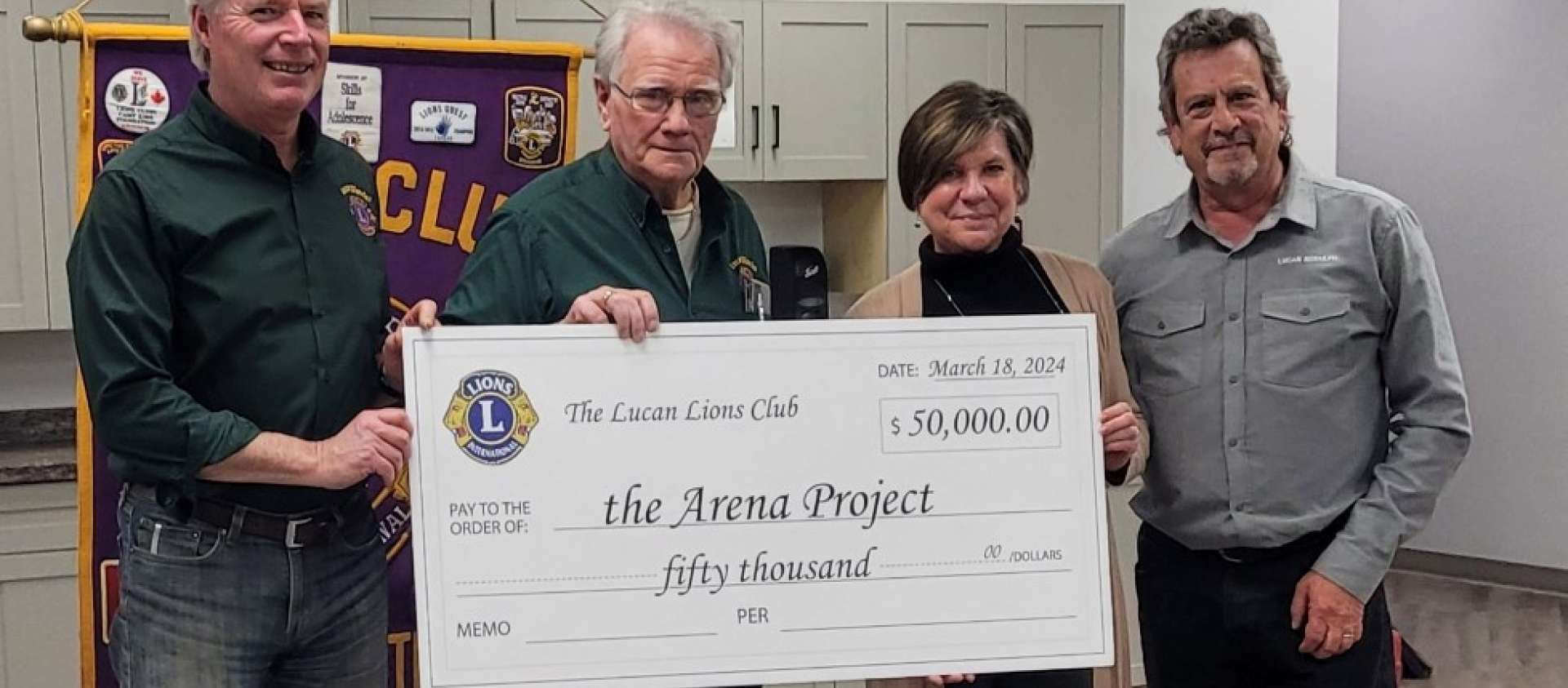 Announcement! Lucan District Lions Club recently presented a donation cheque for $50,000 to Cathy Burghardt-Jesson Mayor, Lucan Biddulph and Councillor Daniel Regan for the Lucan Biddulph Community Memorial Centre's Renovation and Revitalization Project. THIS IS AN ADDITION to their previous donation of $100,000!!! Thank you to the Lion's Club for the continued support of our project!